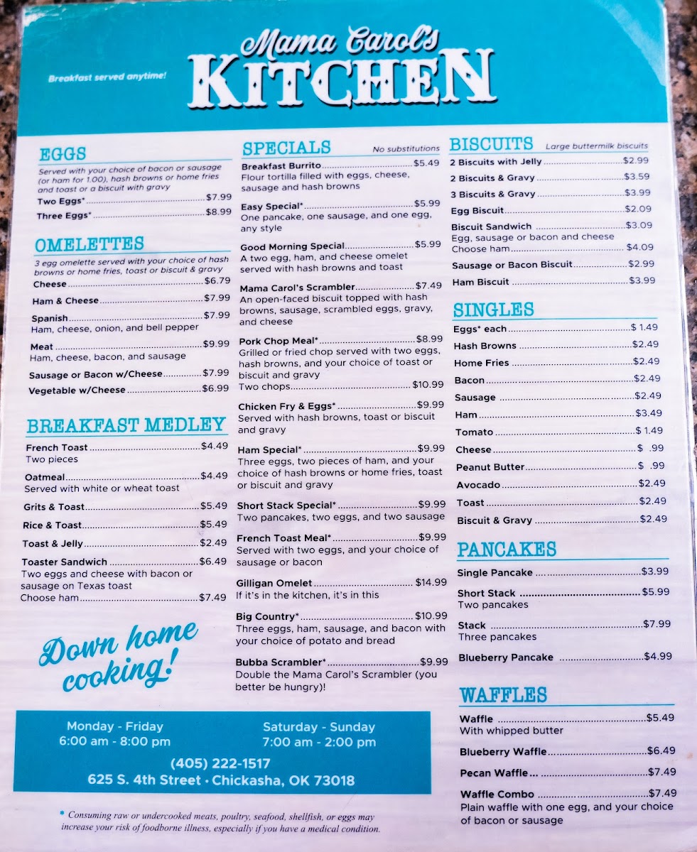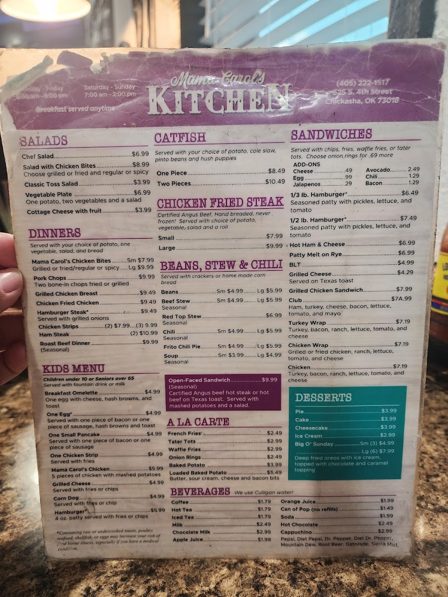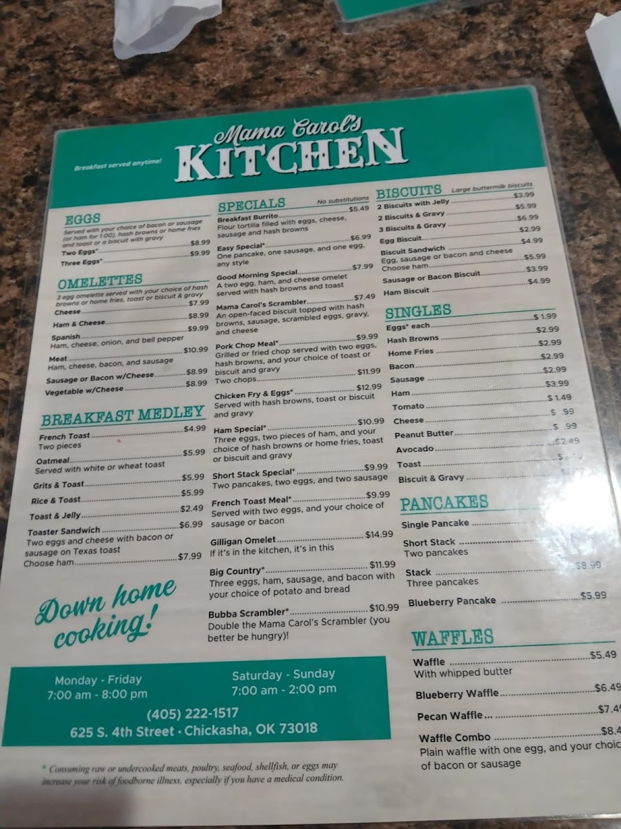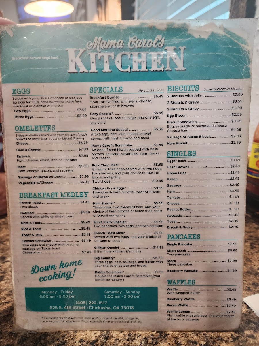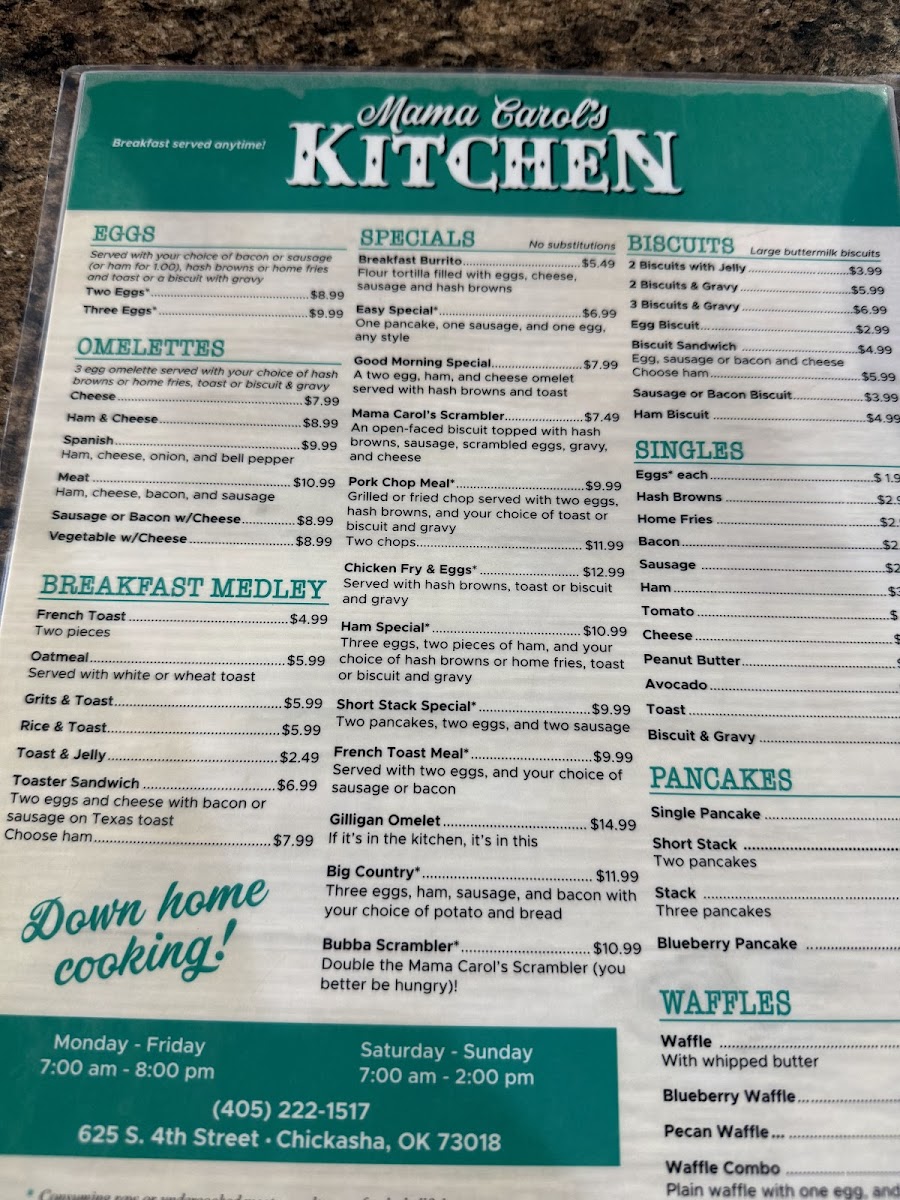 Mama Carol’s Kitchen in Chickasha, OK, offers a warm, home-style diner experience centered around classic and hearty breakfast dishes. Their menu highlights include the Breakfast Burrito — a flavorful blend of eggs, sausage, cheese, and hash browns wrapped in a soft flour tortilla for just $4.99, and the Good Morning Special, featuring a ham and cheese omelet paired with crispy hash browns and toast. For purists, the Classic Breakfast with eggs, choice of potatoes, and toast or biscuit with gravy is a comforting staple.