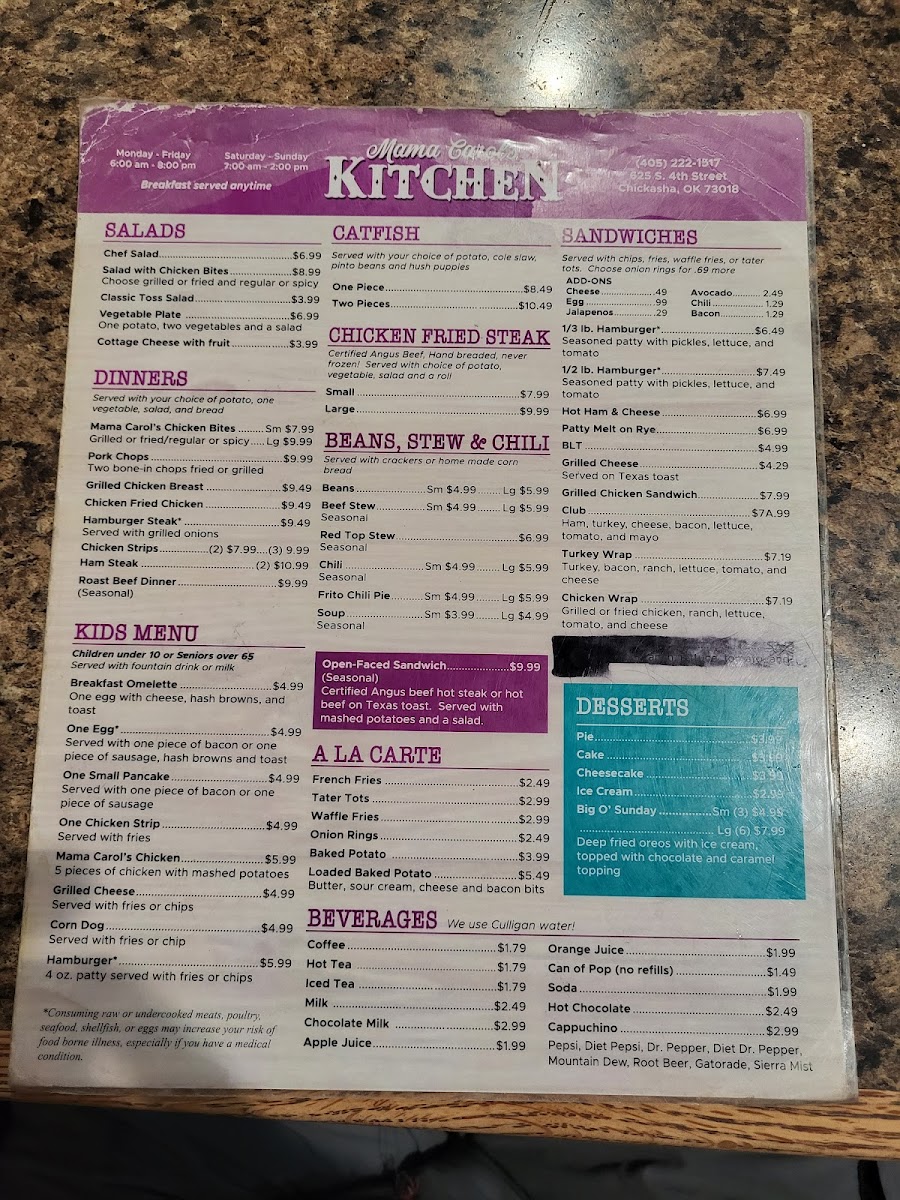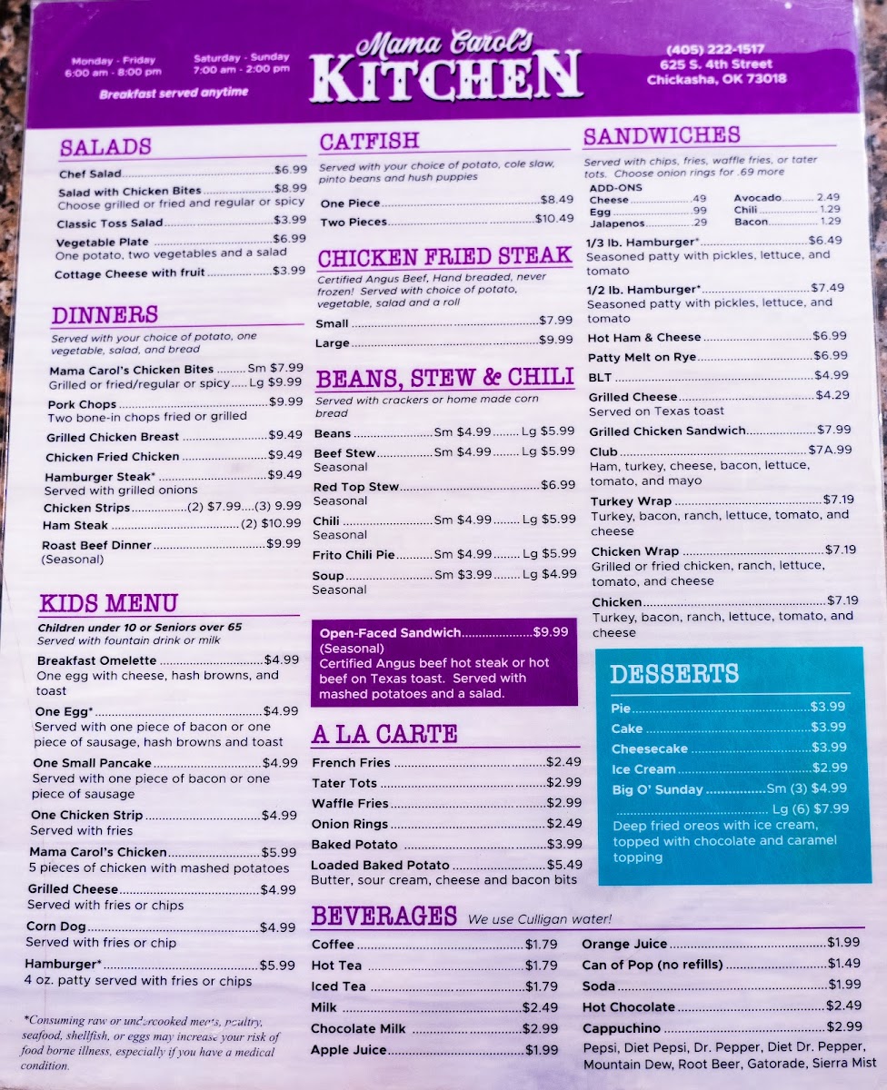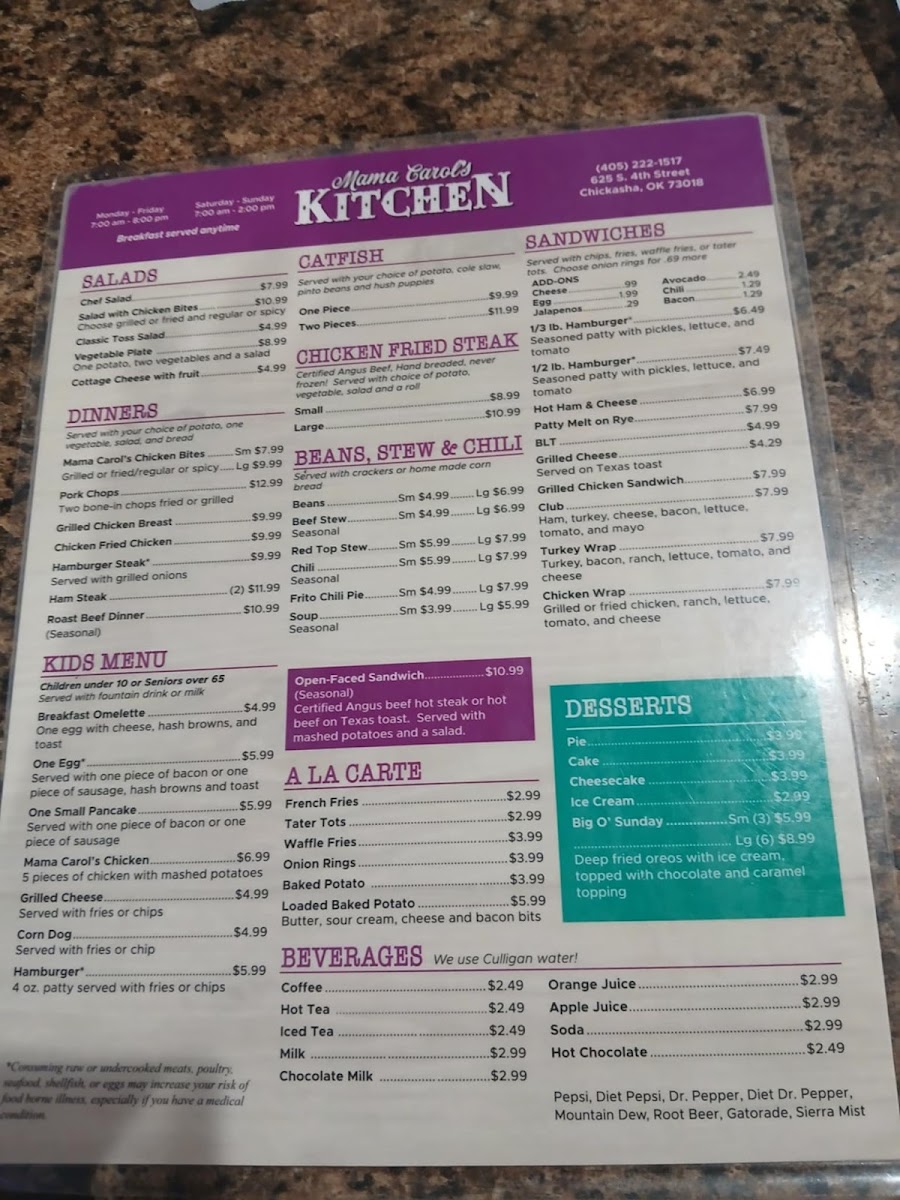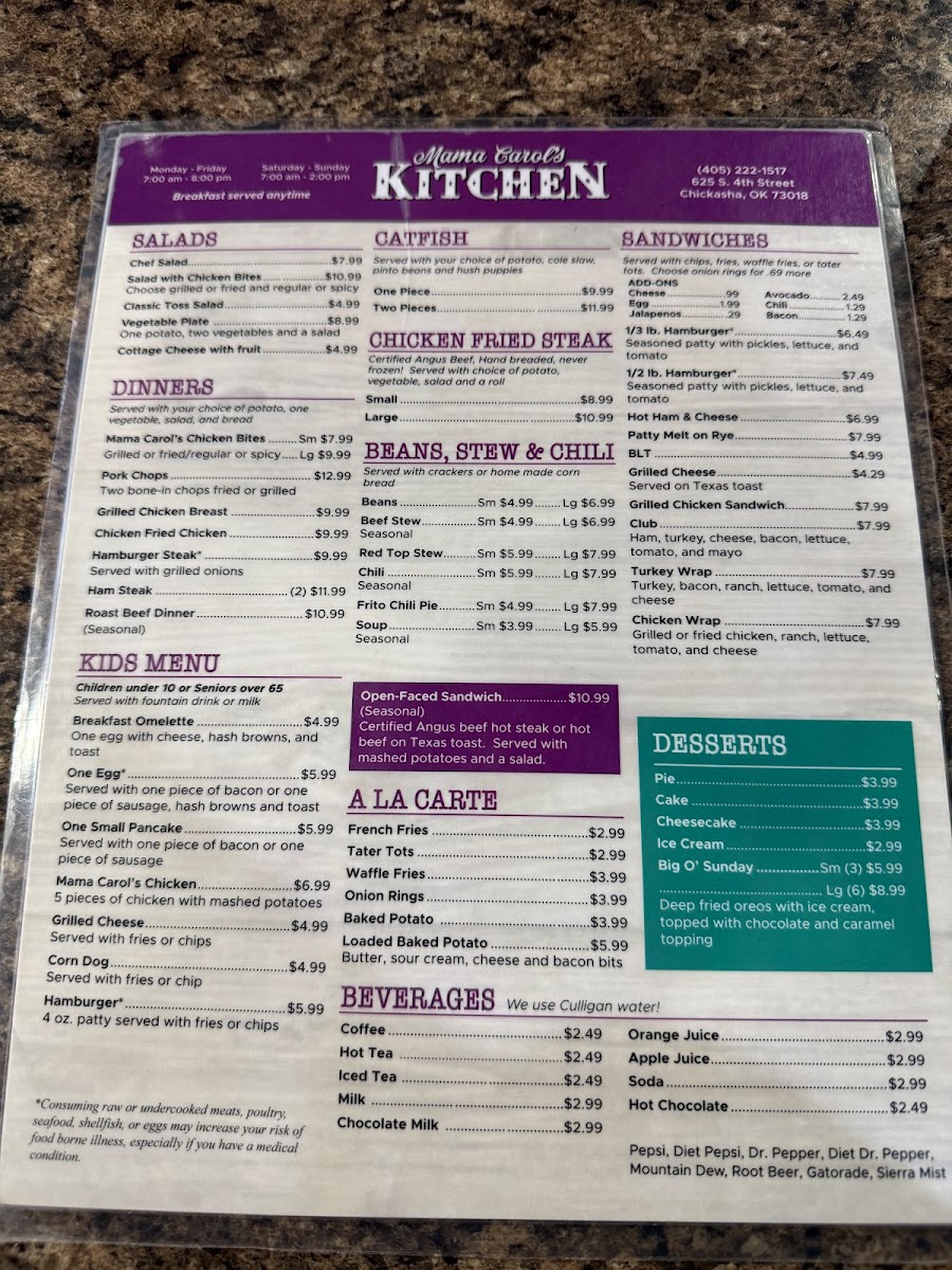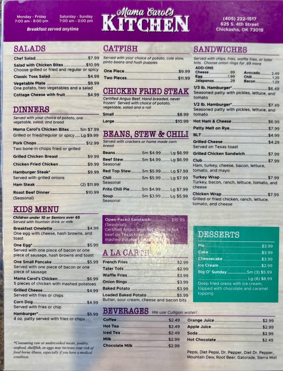 Mama Carol’s Kitchen in Chickasha, OK, offers a warm, home-style diner experience centered around classic and hearty breakfast dishes. Their menu highlights include the Breakfast Burrito — a flavorful blend of eggs, sausage, cheese, and hash browns wrapped in a soft flour tortilla for just $4.99, and the Good Morning Special, featuring a ham and cheese omelet paired with crispy hash browns and toast. For purists, the Classic Breakfast with eggs, choice of potatoes, and toast or biscuit with gravy is a comforting staple.